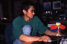 部屋にはMACが3台,それと並んでMIDI機器。(なぜ3台も? どんな仕事なんだろう?)ますます興味がわいてしまった。所属しているのはコンピュータソフトとハードの両方を開発しているシステムハウスの(株)ビー・ユー・ジーという会社。フレックスプレース制を採用しているため、自宅が仕事場となっている。会社に出勤するのではなく自宅など自由な場所で仕事をし、ISDN回線を用いたネットワークを利用して仕事上のやりとりをする。設楽さんの仕事をひと言で説明するのはちょっと難しい。現在の仕事上の肩書きは「プロジェクトプランナー」。具体的に最近の仕事の内容をきいてみた。ここ1・2年は博物館関係の仕事をしているのだそう。 「どうしてこの博物館が必要なのか」という問いから、設楽さんの仕事は始まる。そこに例えば「子供たちに恐竜の生態を知ってもらうため」という答えが成り立てば、それに向けての企画、設計等をはじめる。コンピュータとはあまり縁がないように思えてしまうのだが、実はマルチメディアと大いに関係がある。博物館などで必要な情報は、新しさを追求する「消費型情報」に対して、「恒久型の情報」と呼ばれる。以前は数字、名前といった文字情報が主だったが、今は音や映像が情報としてどんどん蓄えられる。そこで3台のMACが活躍する。MACを駆使し、データベースからその展示法まで、博物館の全てに関わるのである。 机の上に首の長い恐竜のレプリカが見える。博物館の仕事に使ったのだろうか? 「恐竜と名の付くものは片っ端から買った」のだそう。仕事から「趣味」に昇華してしまったようだ。「好きになった物はとことん好き」な設楽さんである。 |