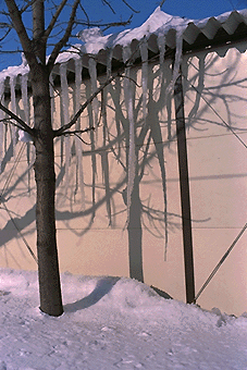 今日は暖かい。雪が溶けだし長い氷柱ができた。