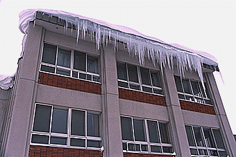 軒先の氷が今にも落ちそう。