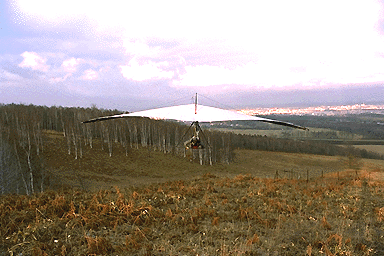 牛のいなくなった放牧地に、 ハンググライダーがとんできた。