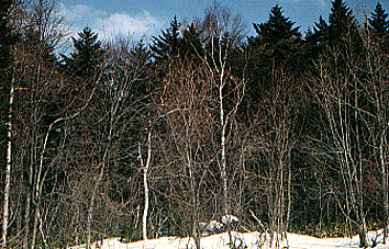 落葉樹は、すっすり葉が落ちて しまったが、松の葉は濃い緑をた たえている。
