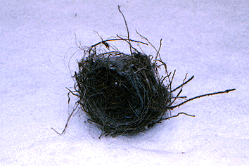 強風に小鳥の巣が飛ばされた。 よく見ると巣の材料にビニールひも まで使っている。