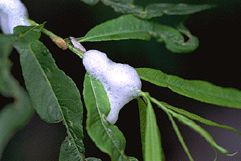 マエキアワ虫は、やなぎの枝に 泡を作りこのなかで生活する。