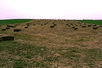 7/8 7/23 牧草の収穫が始まった。機械で刈り 取った草を天日干にして運びやすい大 きさに束ねたんだ。後で牛舎の二階し まうんだよ。
