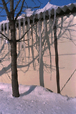 今日は暖かい。雪が溶けだし長い氷柱ができた。